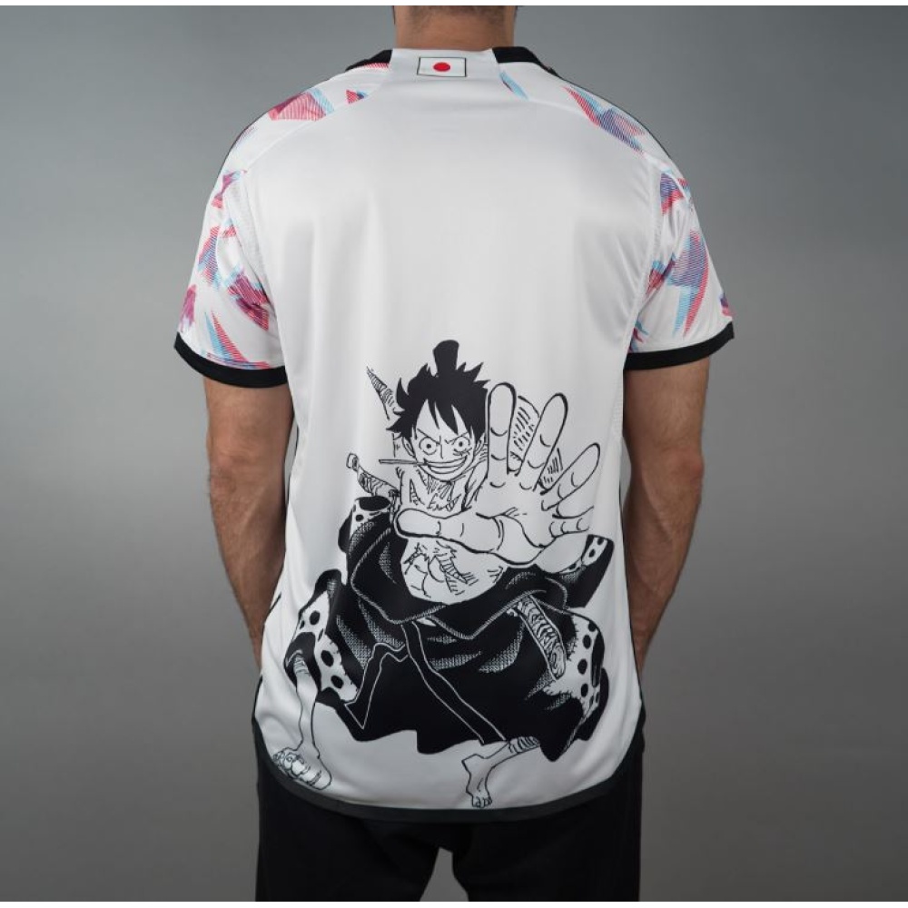 The all-white jersey showcases modern aesthetics inspired by the character Luffy, making it a standout piece for anime and football fans alike.