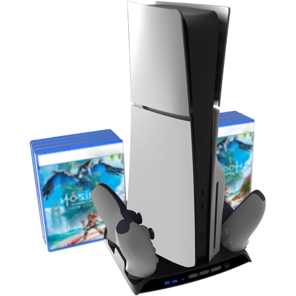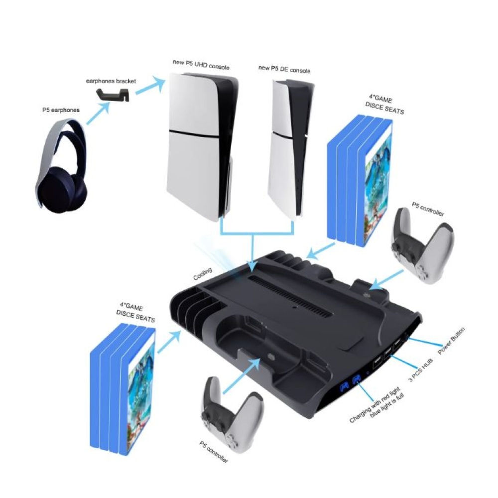 Upgrade your PS5 Slim setup with the KJH Multifunctional Cooling Fan Base 🚀. This all-in-one accessory combines efficient cooling, disc storage, and headphone charging to keep your gaming area organized and your console performing at its best.