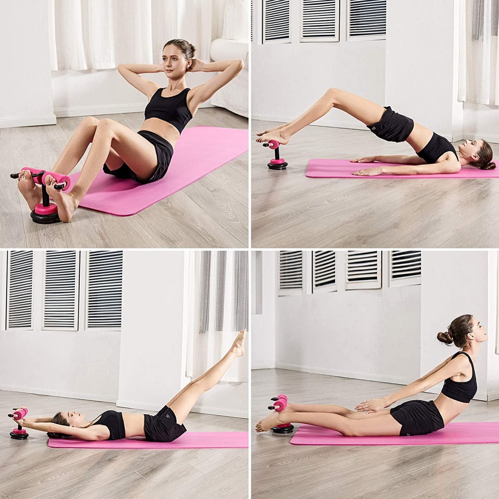 Combines ab roller, push-up stands, and suction cups in one.