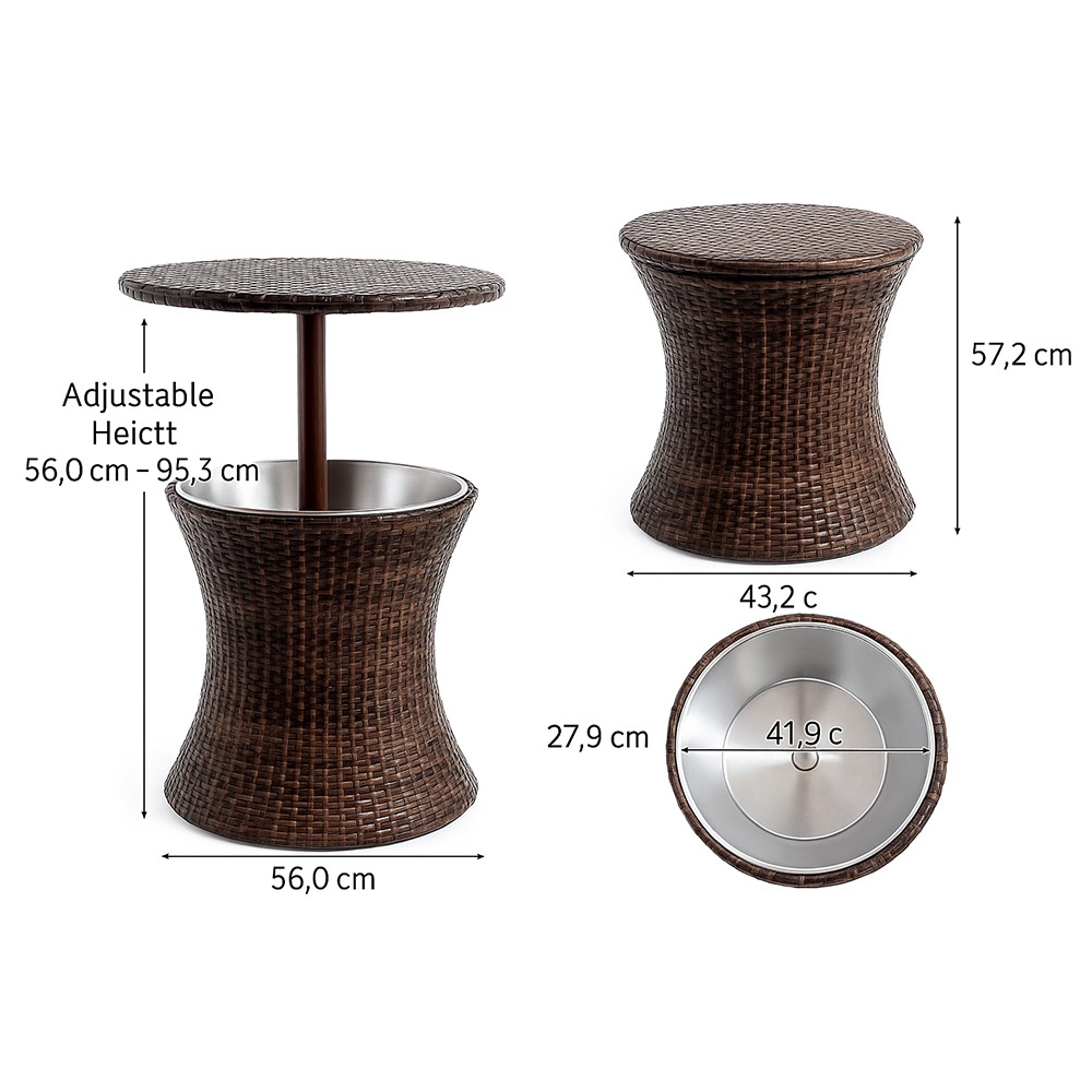 Combines a cooler, cocktail table, and coffee table with adjustable height to meet various needs. Perfect accessory for BBQs and summer parties.