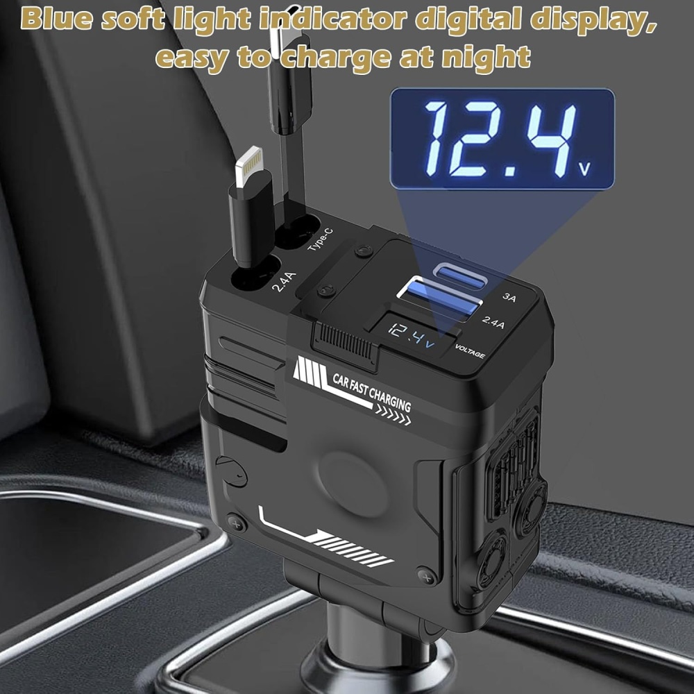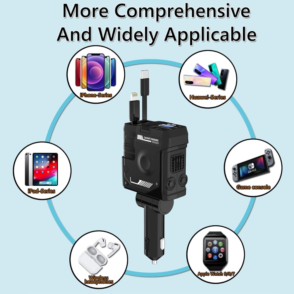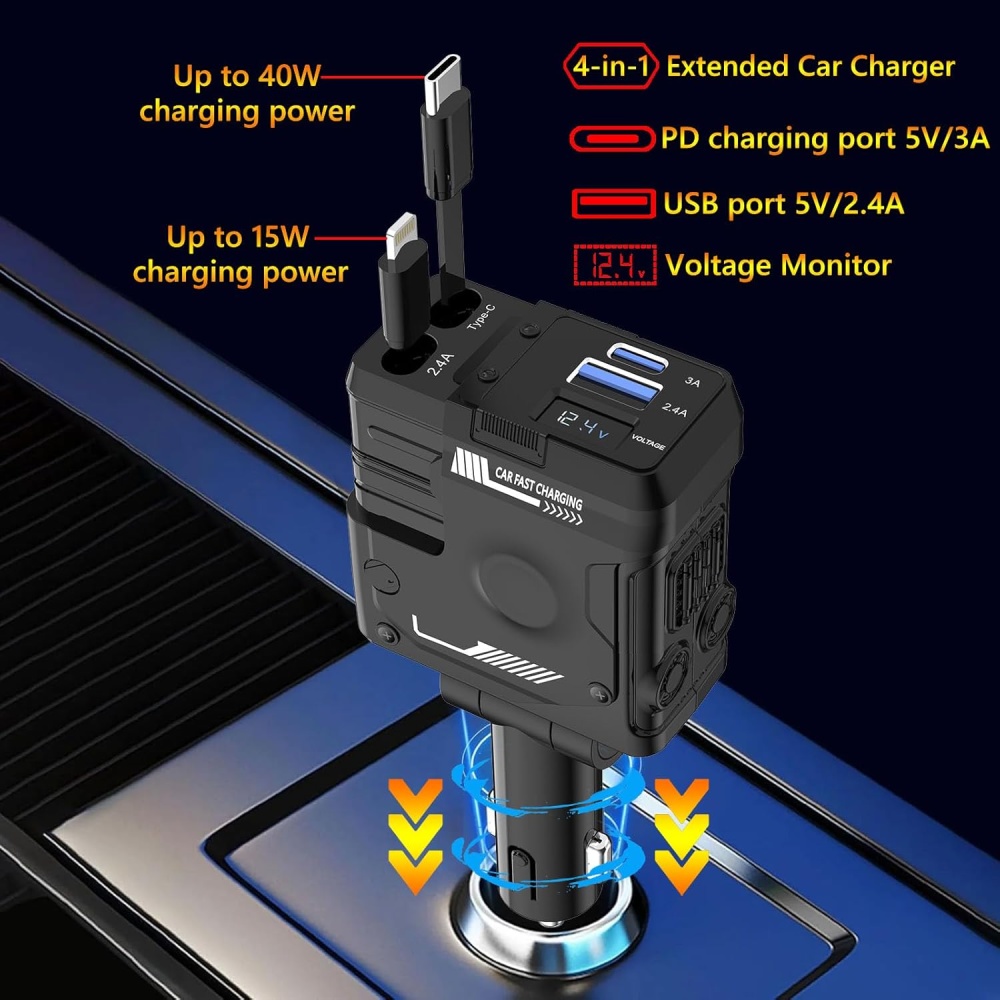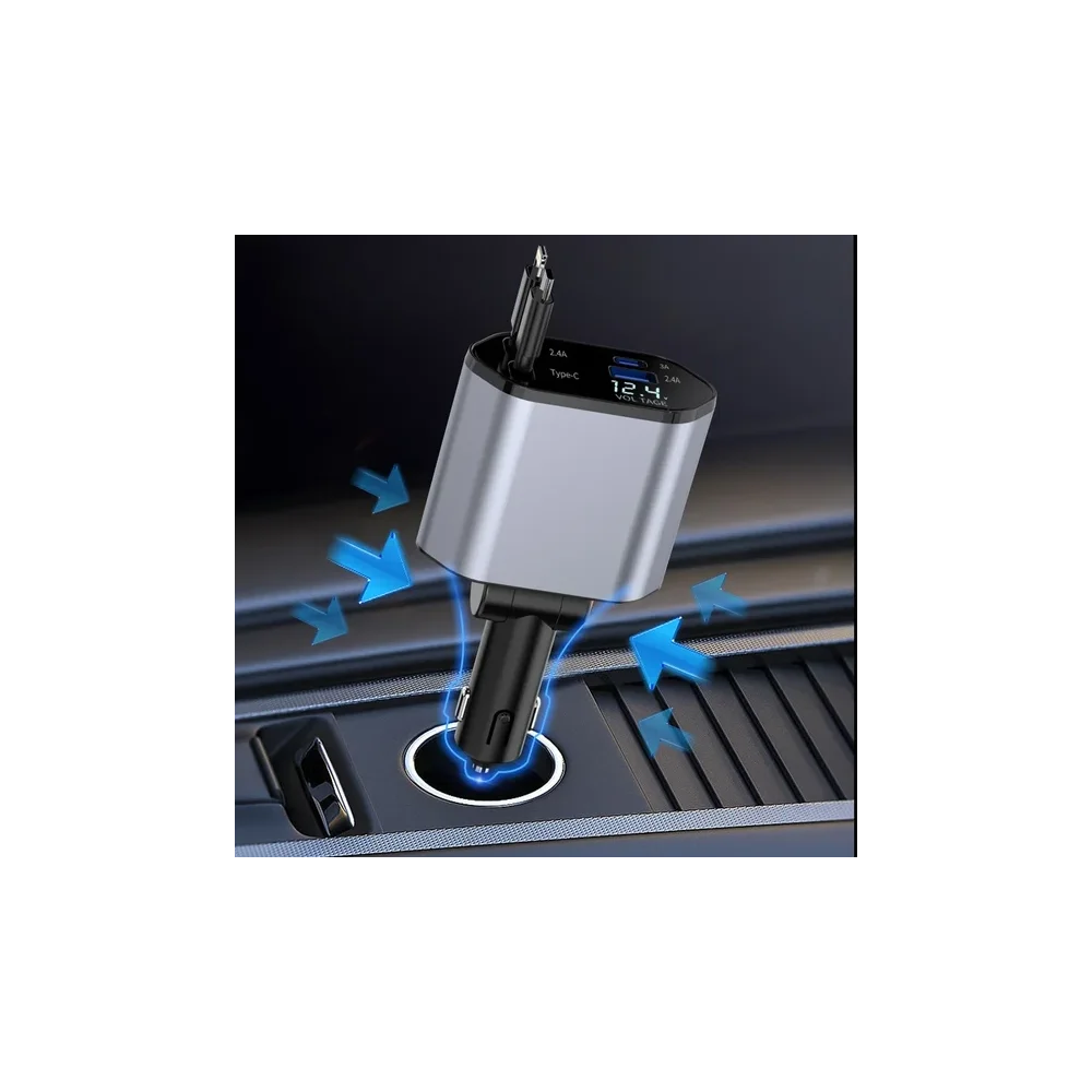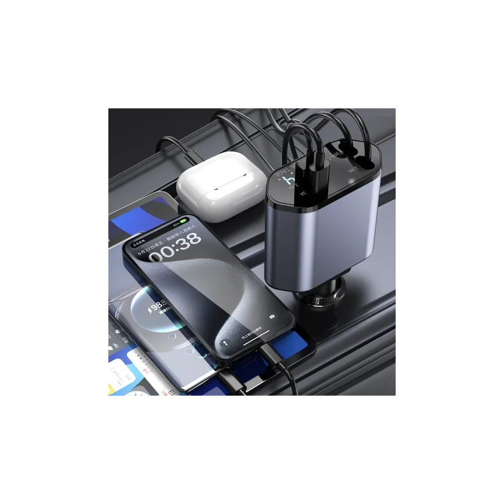 The Retractable Car Charger is designed for maximum efficiency, providing fast, stable, and continuous charging through the car's cigarette lighter socket. With 4 ports (USB-C, Lightning, and two USB charging ports), you can charge up to 4 devices simultaneously without waiting for your turn.