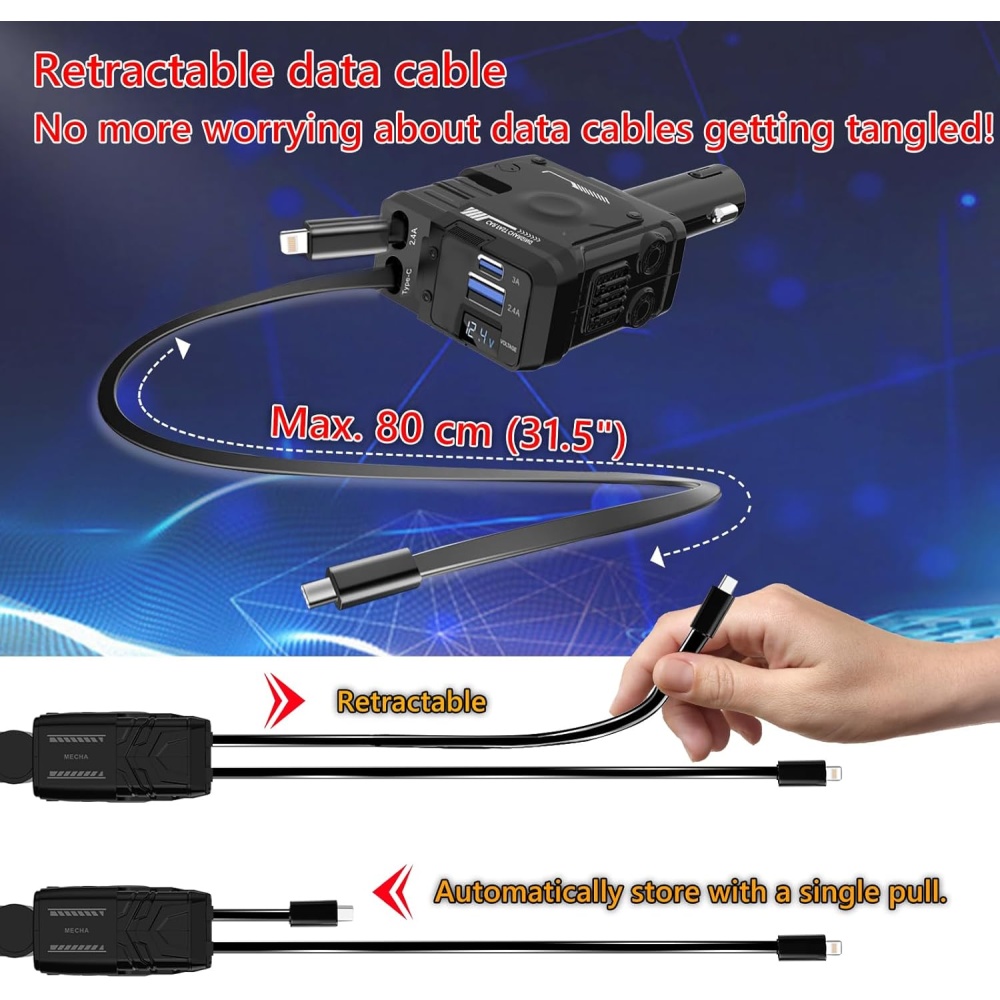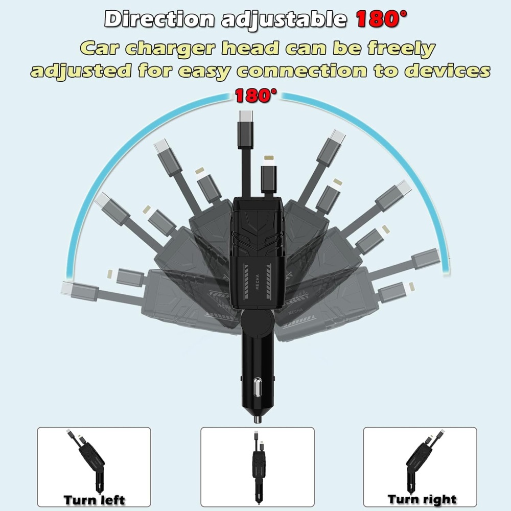 Equipped with 2 retractable 80cm cables (Type-C and Lightning), this charger is not only compact but easy to store. The cables retract neatly into the charger, making it ideal for small spaces and keeping your car organized.
