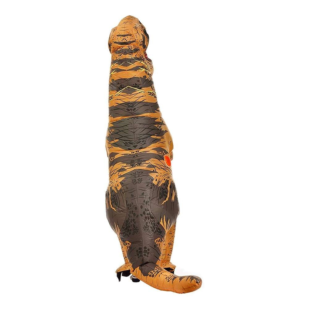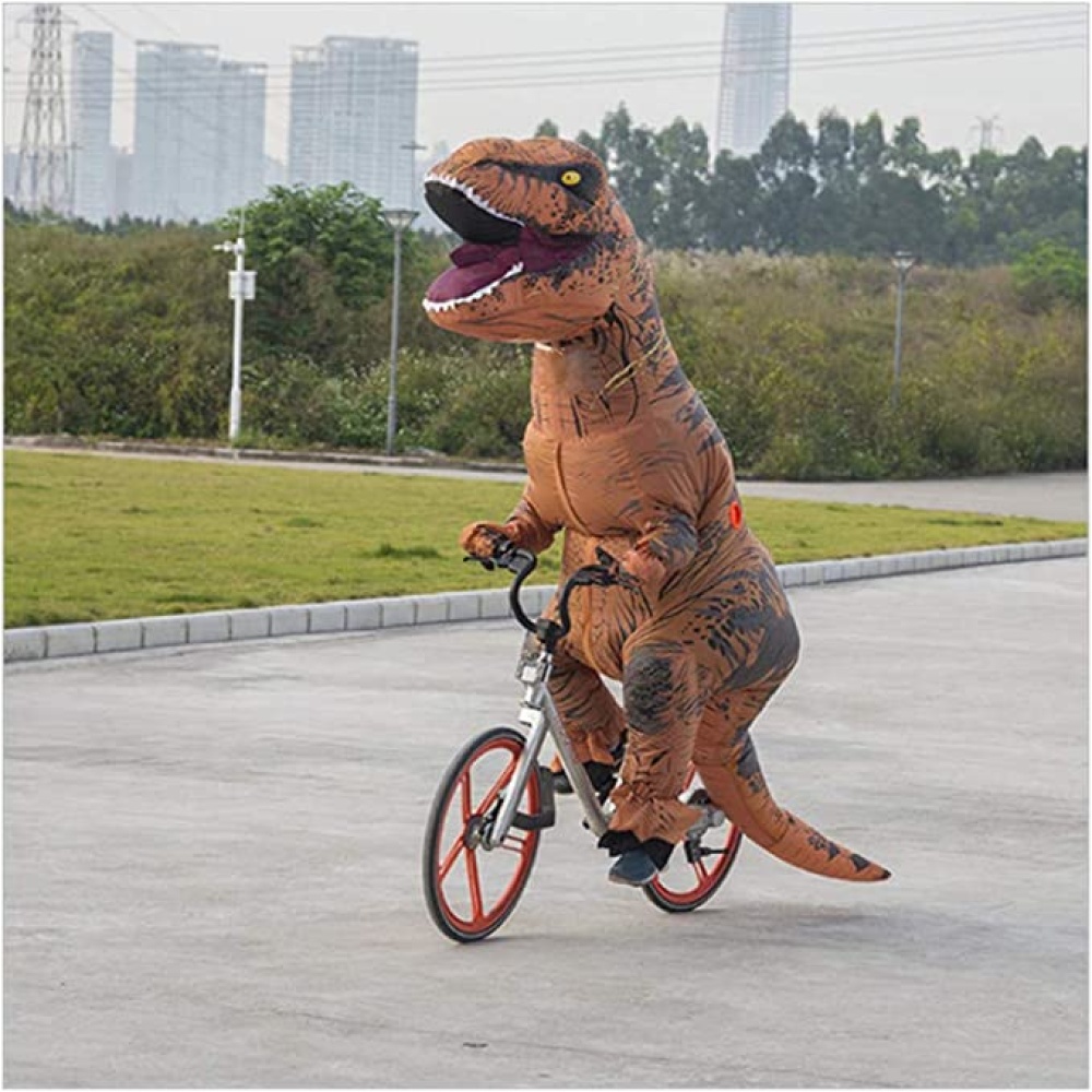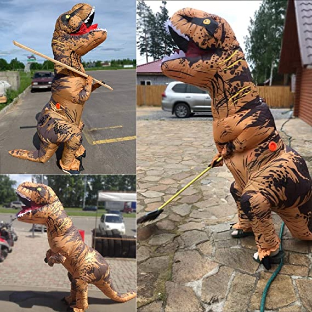 Transform into a roaring T-Rex with this inflatable brown dinosaur costume, perfect for Halloween and parties.