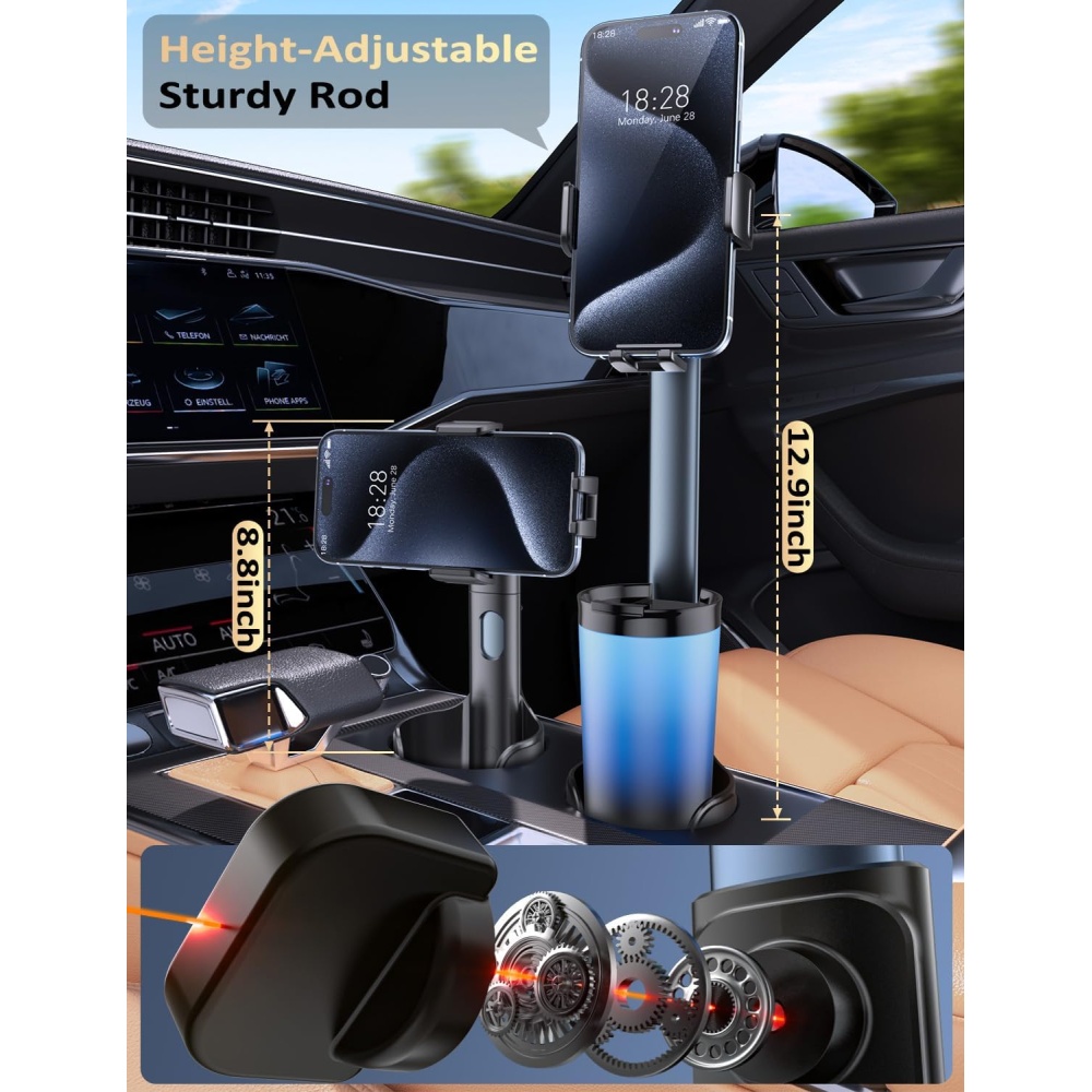 Vertical lifting aluminum support rod ensures your phone stays accessible without blocking the cup holder or interfering with the car’s operating space.