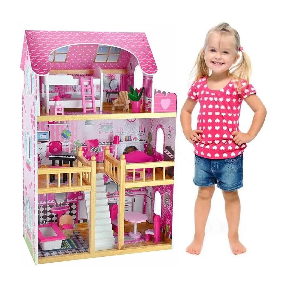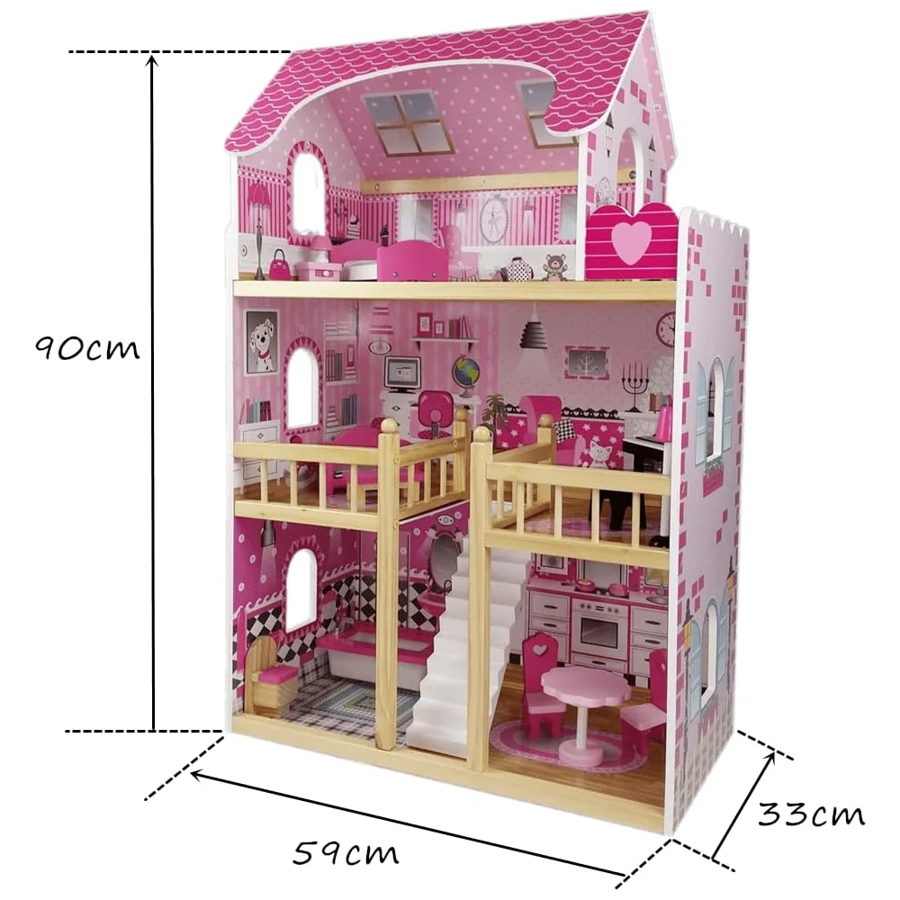 Create a world of imagination and endless fun with this beautiful 3-storey pink wooden dolls house. Designed especially for kids, this large dollhouse offers plenty of space for creative role-play while delivering durability, safety, and timeless charm.