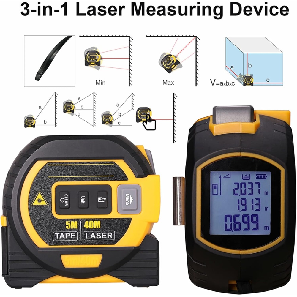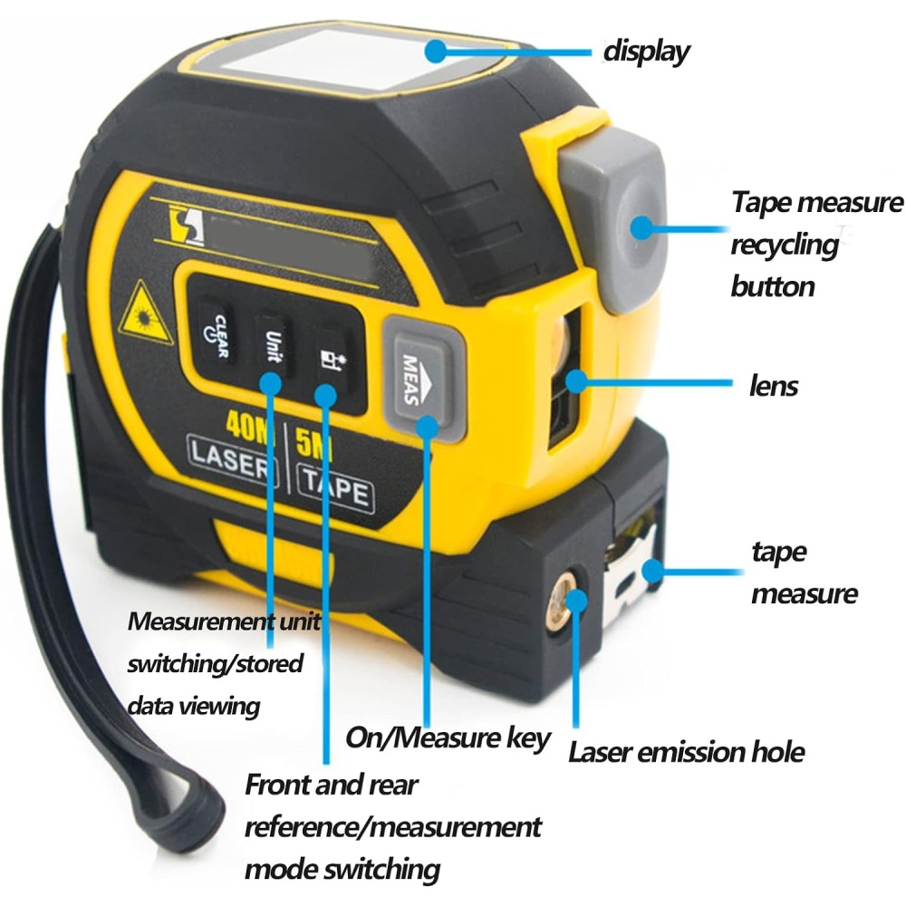 Upgrade your measuring accuracy with this advanced 4-in-1 digital laser tape measure, combining laser distance measurement, steel tape, and smart functions in one compact device. Perfect for professionals and home use in construction, interior design, and renovations. Combines 40m (131ft) laser measurement, 5m (16ft) tape measure, and laser cross marking in one device. Accurate up to ±1/8 inch with advanced laser technology. Includes distance, continuous measurement, area, volume, and Pythagorean functions. Supports both metric and imperial units with easy switching. Shock-resistant ABS body with rubber grip for comfort and durability. Clear digital screen for easy reading even in low light. 5m tape with magnetic hook, dual scale, and smooth auto rewind. Stores up to 20 measurements for quick access. The digital display shows laser measurements only, not tape measurements.📏 4-in-1 Digital Laser Tape Measure – 131Ft/40m Infrared Laser | High Precision Measuring Tool