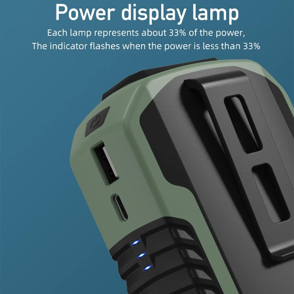 Equipped with a USB 5V/2A output, it doubles as an emergency mobile power bank for smartphones and USB devices.
