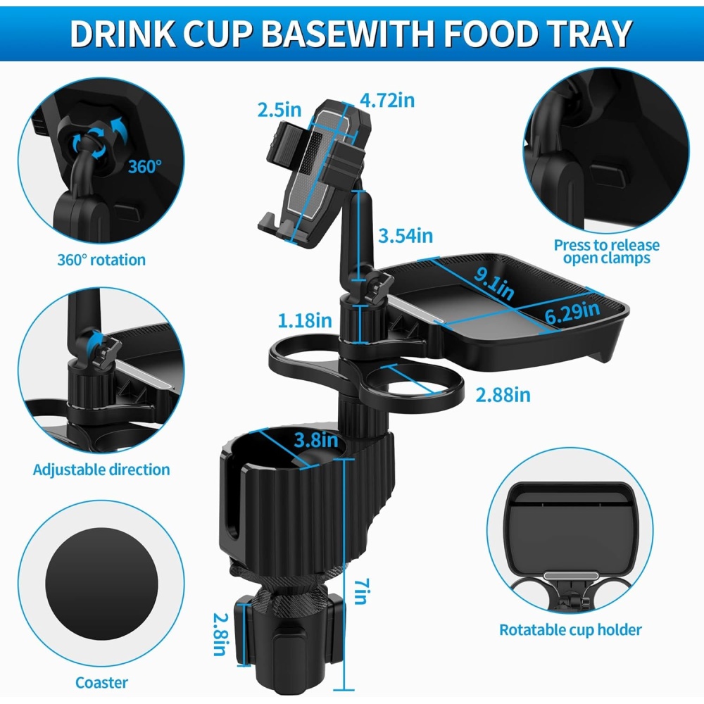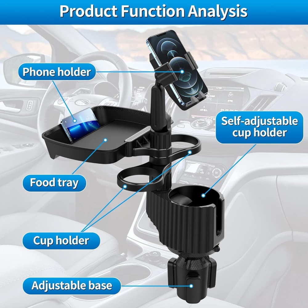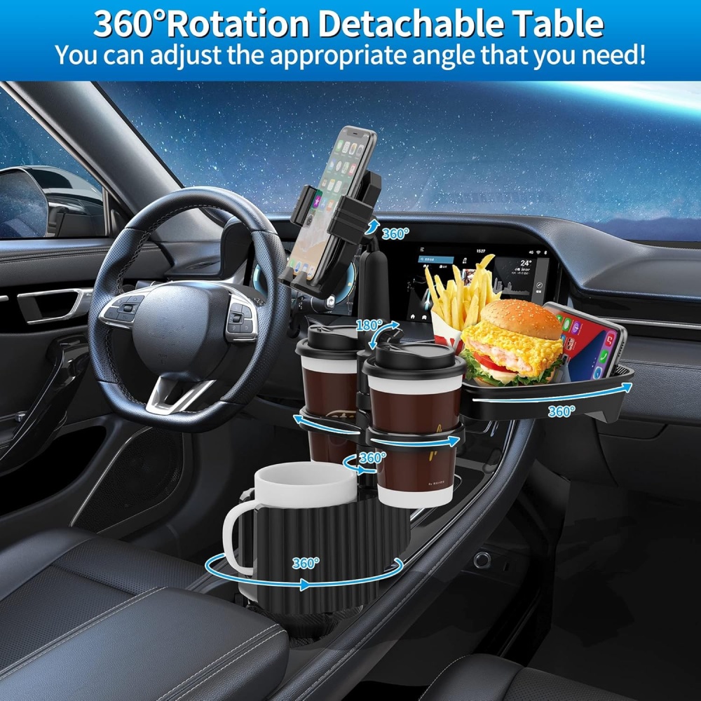 4-in-1 Adjustable Car Tray with 360° Rotation – Cup Holder, Phone Stand & Food Tray