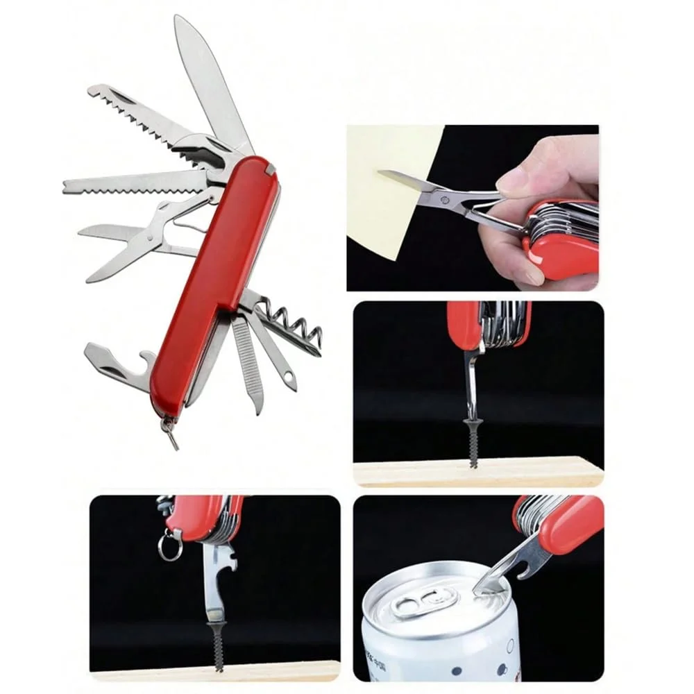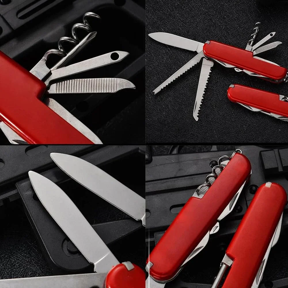 Includes knife, can opener, bottle opener, corkscrew, screwdriver, nail file, and scissors β everything you need in your pocket.