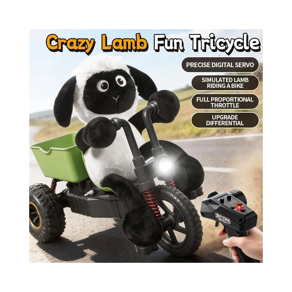 A charming plush lamb rides a high-speed drift tricycle with a green cargo trailer 🚛, creating a fun and eye-catching remote control toy experience.