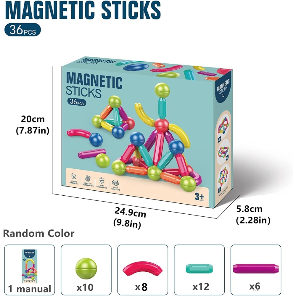 Β 36 PCS SET This Magnetic Balls and Rods Set includes: 10 metal balls, 8 curved bars, 12 short bars, 6 long bars. Abundant accessories can be assembled into a variety of shapes, worth buying. Magnetic Balls and Rods have a variety of different colors, kids learn through exploration and cultivate color perception ability.