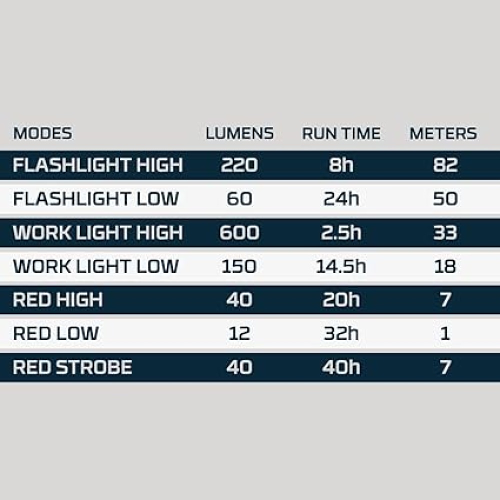 - Work Light High (600 lumens): Gives 2.5 hours of use with a range of 33 meters.