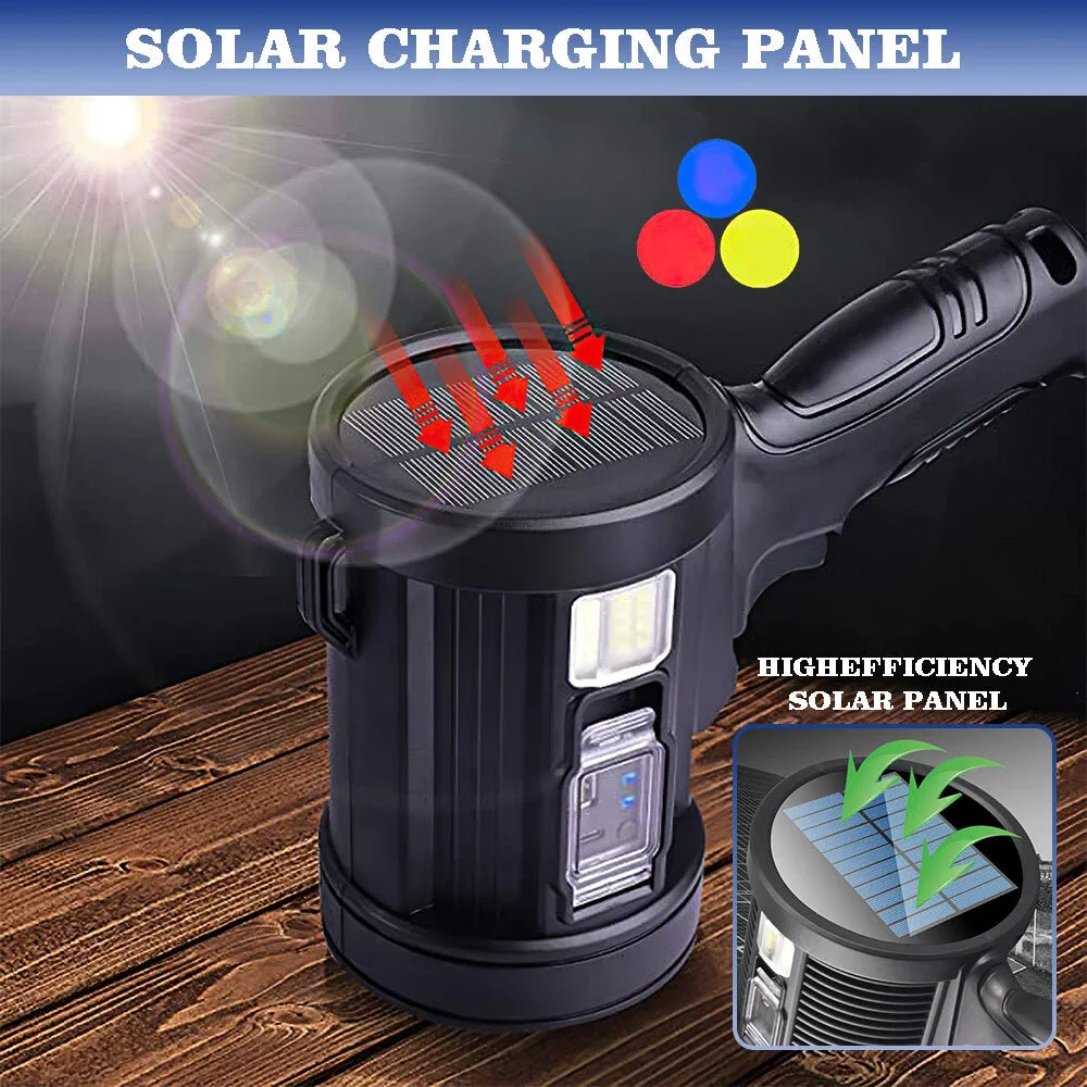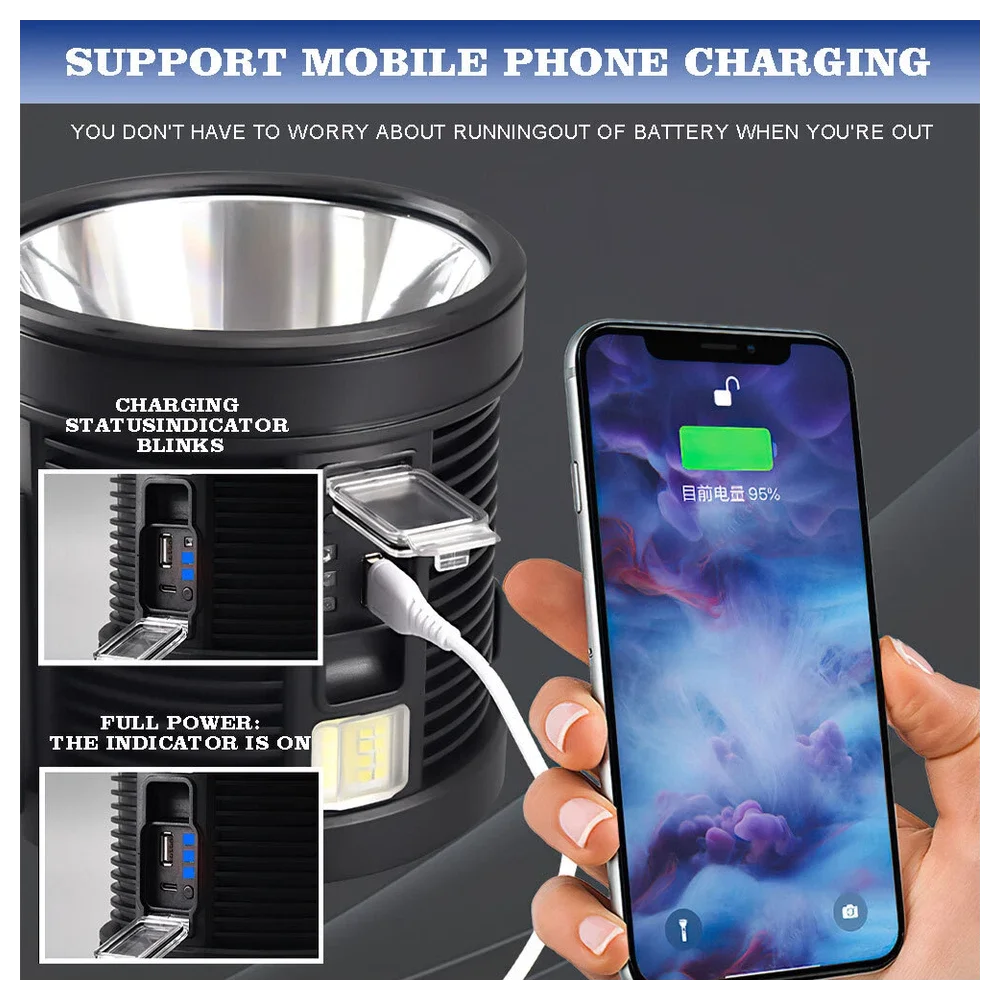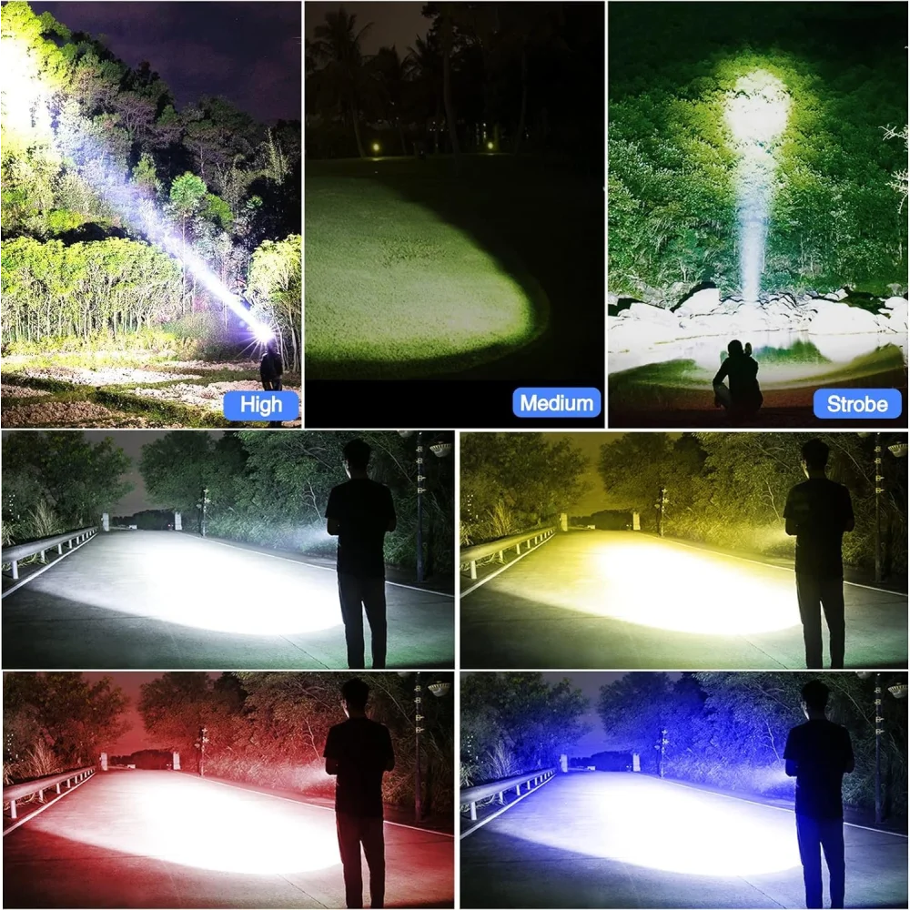 Ultra-bright handheld LED flashlight designed for outdoor use, delivering thousands of lumens with a range up to 30 meters.