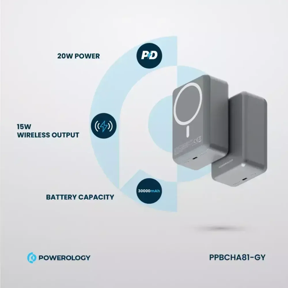 The Powerology 30000mAh MagSafe Aluminum Power Bank combines high capacity, fast charging technology, and wireless convenience in one premium portable charger. With its strong battery, sleek aluminum design, and MagSafe compatibility, it’s the perfect power solution for modern mobile users.
