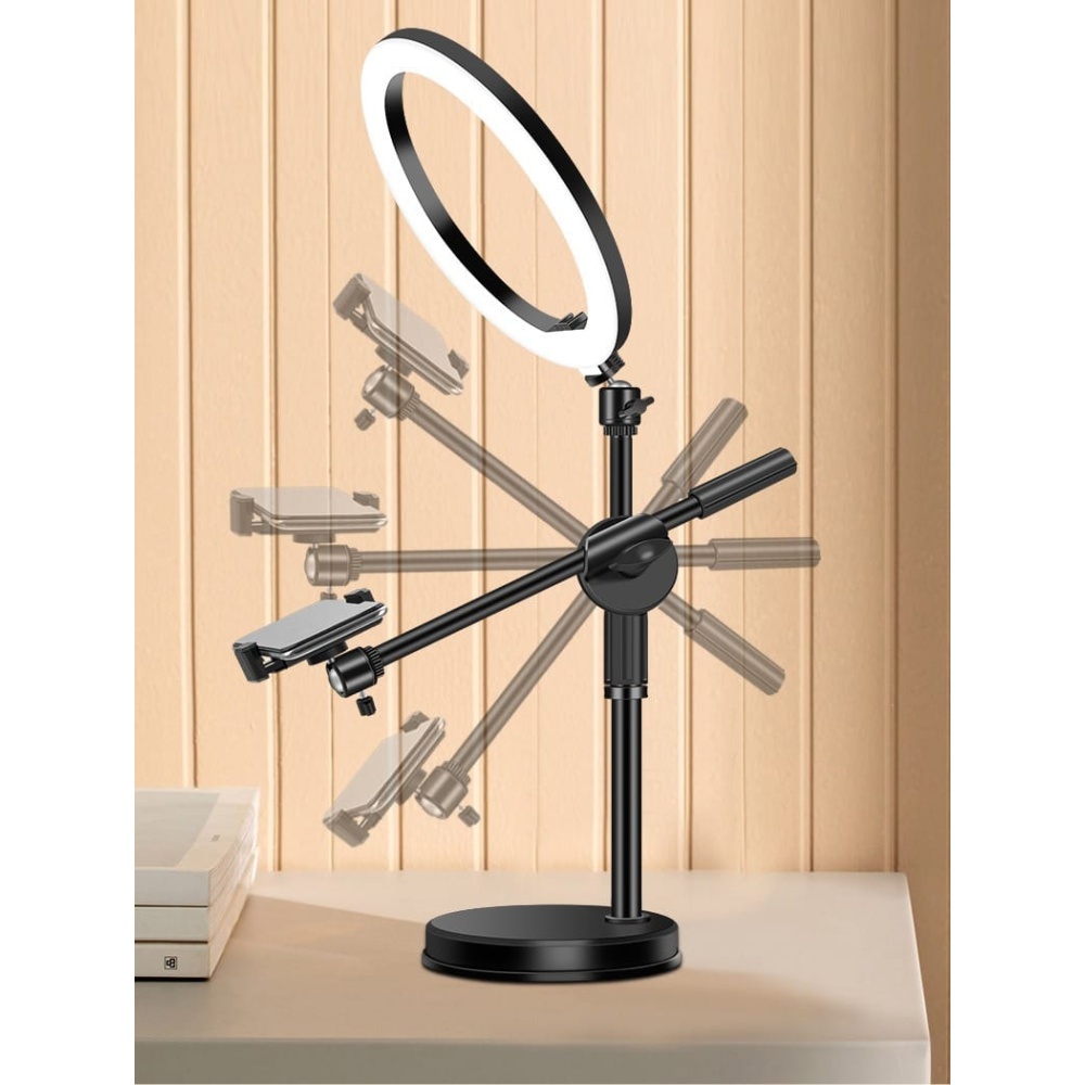 Ring light, adjustable stand, two phone holders, and secure mounting accessories.