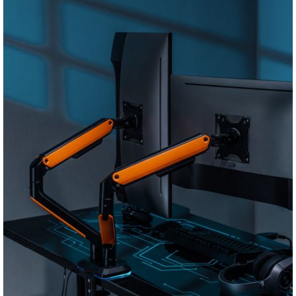 Optimize your dual-monitor workstation with flexible positioning, dynamic RGB lighting, and a sleek, space-saving design. Perfect for productivity, gaming, and content creation.