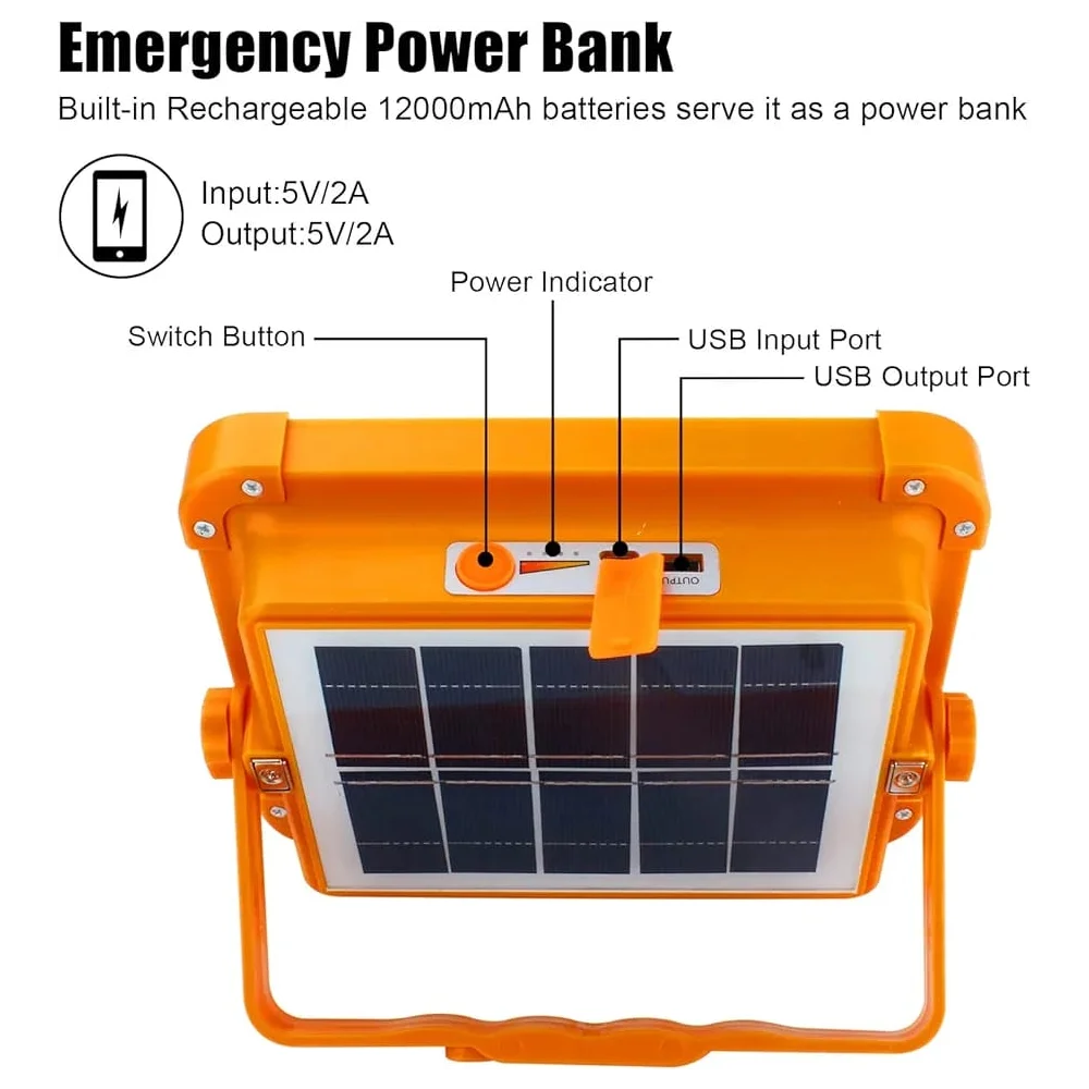 Equipped with a powerful 12000mAh battery, rechargeable via USB cable or solar panel.
