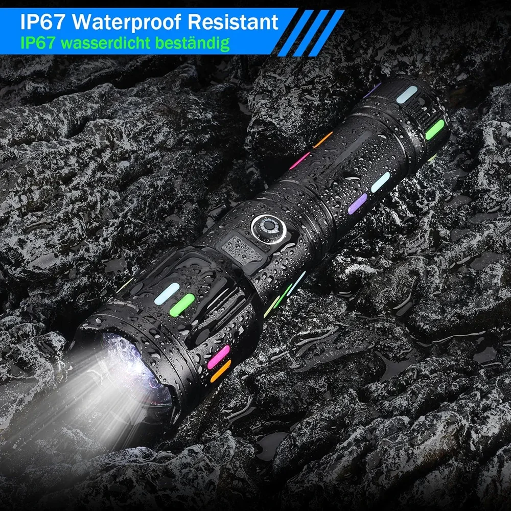 Equipped with an advanced LED chip that delivers up to 200,000 lumens for extremely bright illumination. The flashlight can also absorb and store sunlight or light, allowing it to glow in the dark without switching it on.