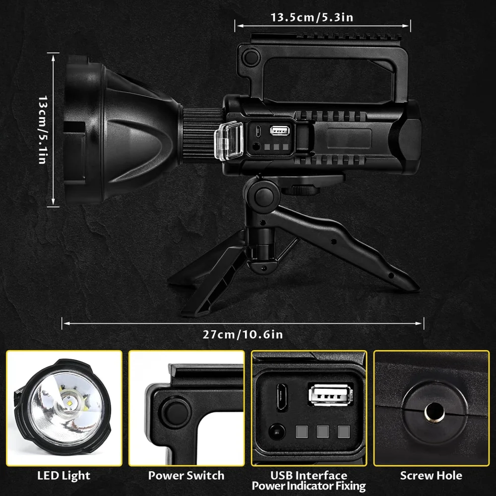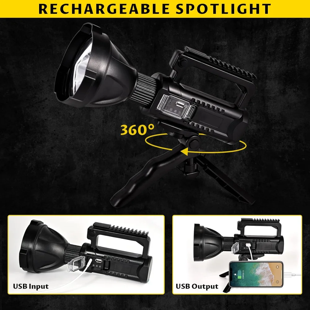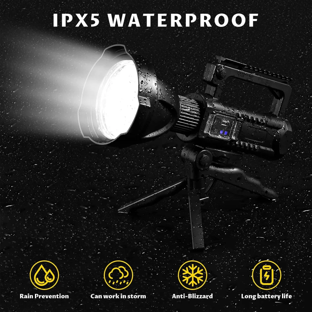 Light up any environment with the W513 Rechargeable Multifunction Spotlight. Designed for powerful performance, this spotlight delivers up to 10,000 lumens brightness and an impressive 1000-meter beam distance, making it ideal for outdoor adventures, emergency situations, and professional use. With a large 10000mAh battery, USB charging, and a detachable tripod stand, it provides maximum convenience and reliability.