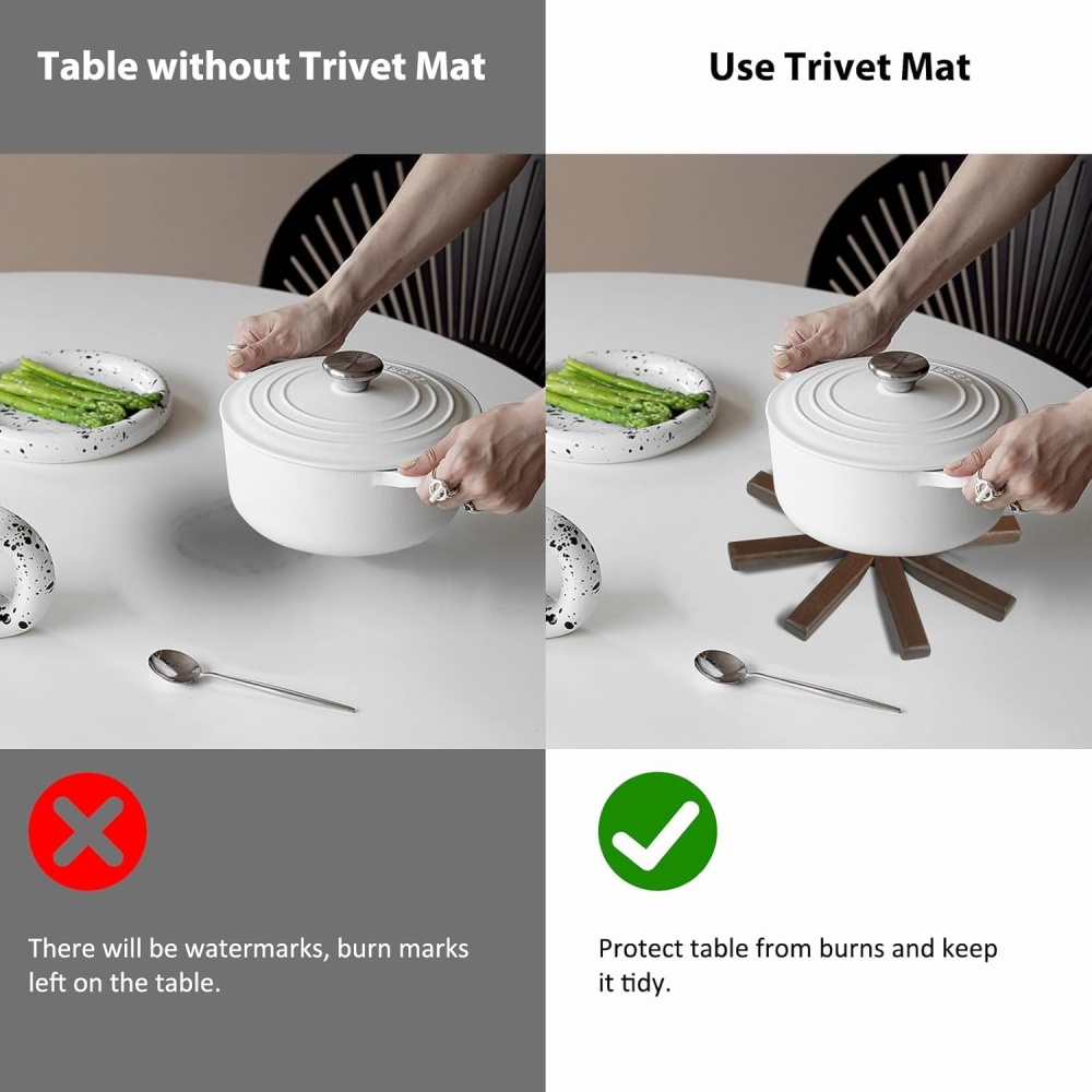 The black walnut color adds a beautiful, rustic touch to any kitchen or dining room. The trivet set is not just functional; itβs also an ornamental piece that enhances the aesthetics of your home. Perfect for Christmas or housewarming gifts, it combines practicality with festive charm, making it a great addition to any home.