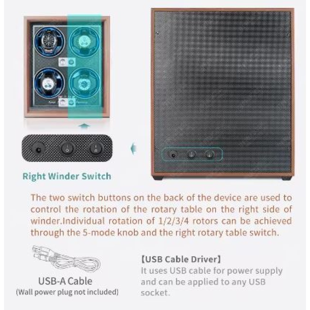 The watch winder has a 4-slot capacity, offering ample storage for multiple watches. Keep your luxury watches safe, secure, and wound properly when not in use.