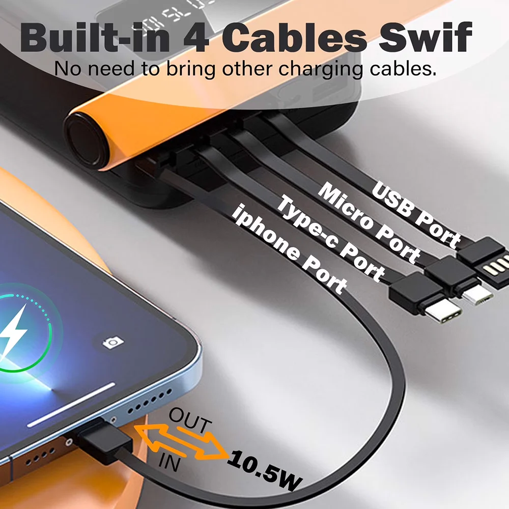 Comes with 4 built-in cables (Micro USB & Type-C) for universal compatibility—no need to carry extra cables 🎯