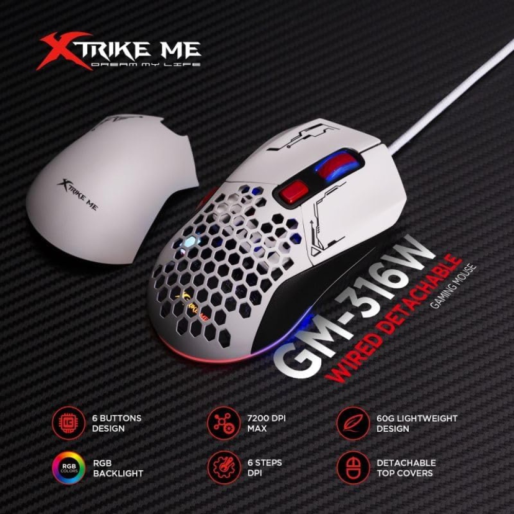 The XTRIKE ME GM-316W is a high-precision RGB gaming mouse designed for gamers who want accuracy, style, and durability. With adjustable DPI levels up to 7,200 and a long-lasting 3-million-click lifespan, this mouse delivers consistent performance in a sleek white finish.